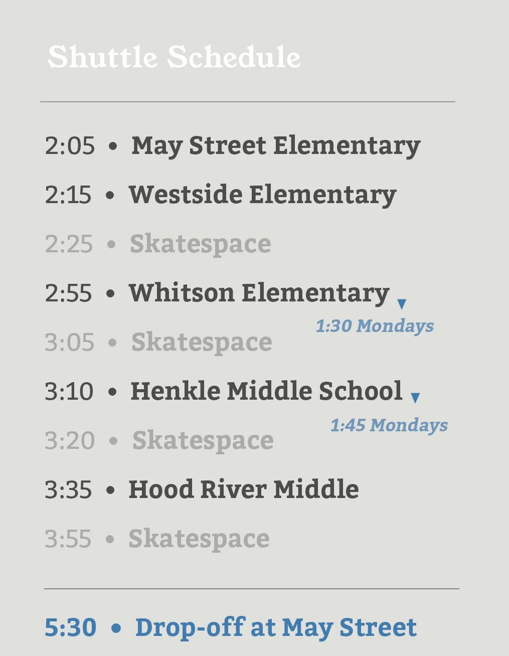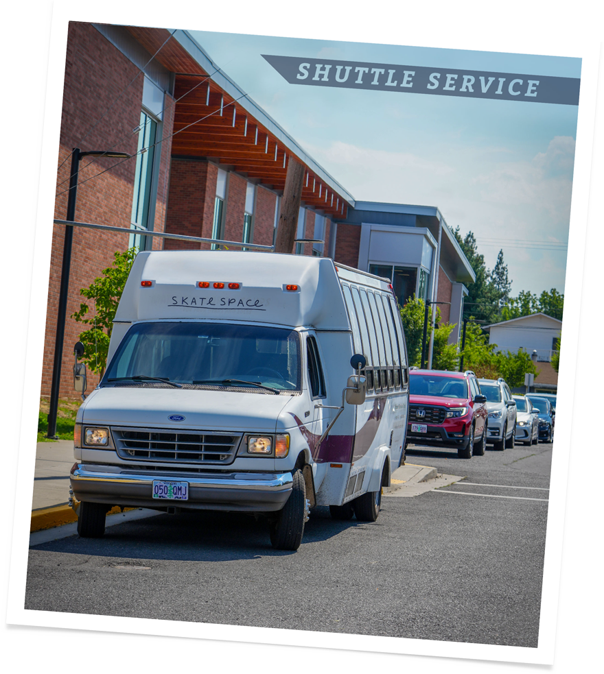 We welcome skaters of all ability levels, including total beginners, ages eight and up. Drop skaters off directly at Skatespace, or take advantage of the Skate Club shuttle service from Elementary and Middle Schools in both Hood River and White Salmon, every weekday!